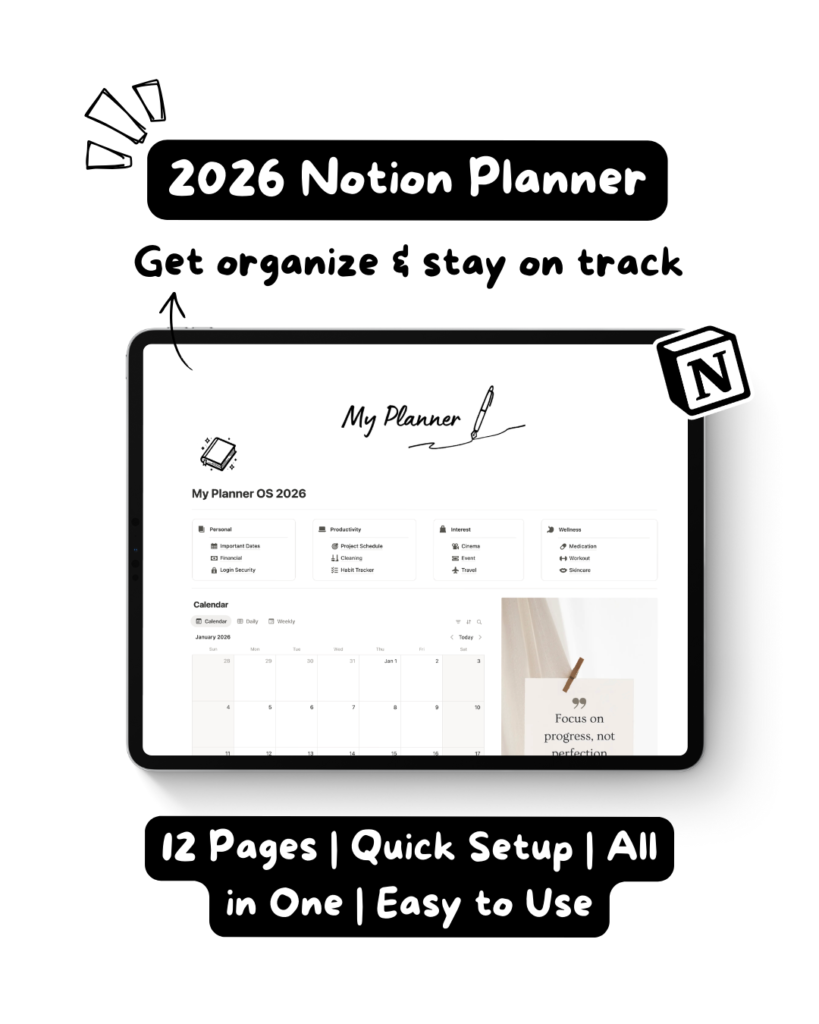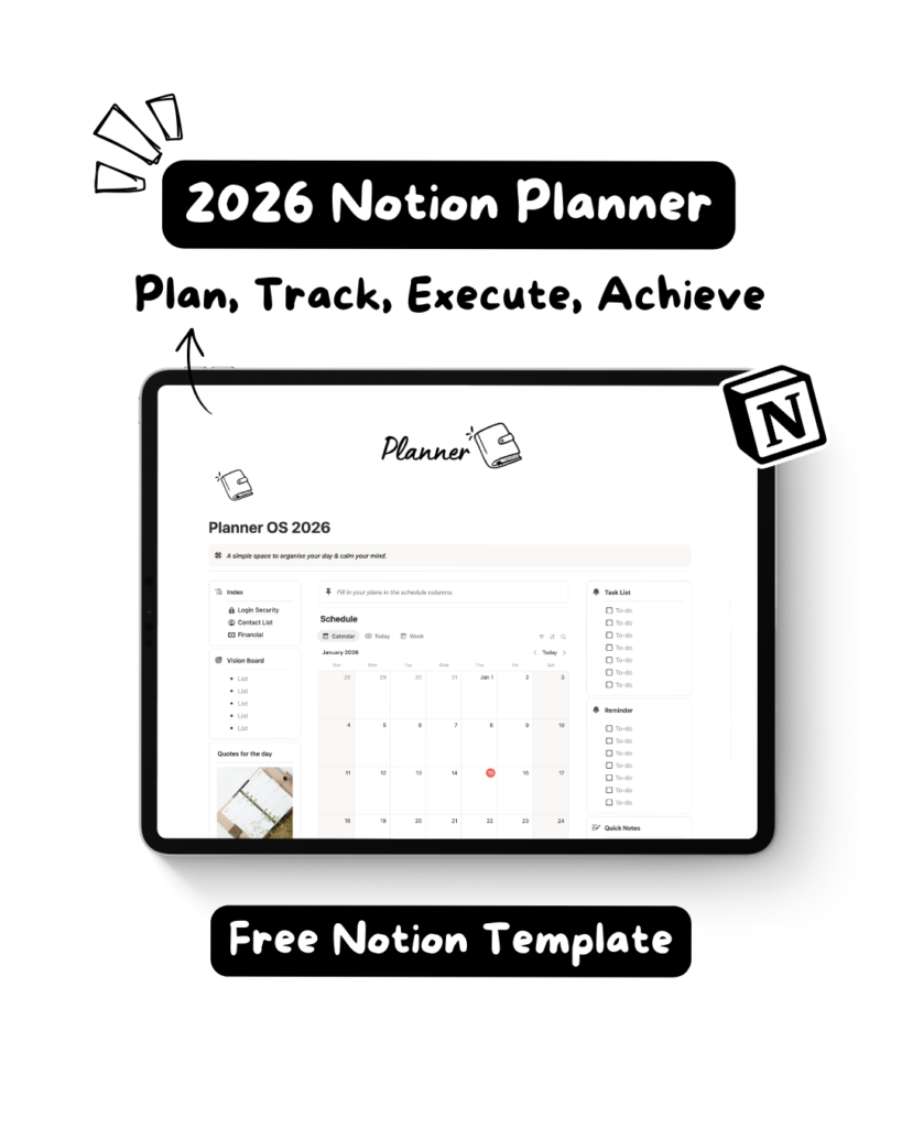 Plan your days with clarity, focus, and intention. A simple Notion planner to help you stay organized and mindful throughout 2026.