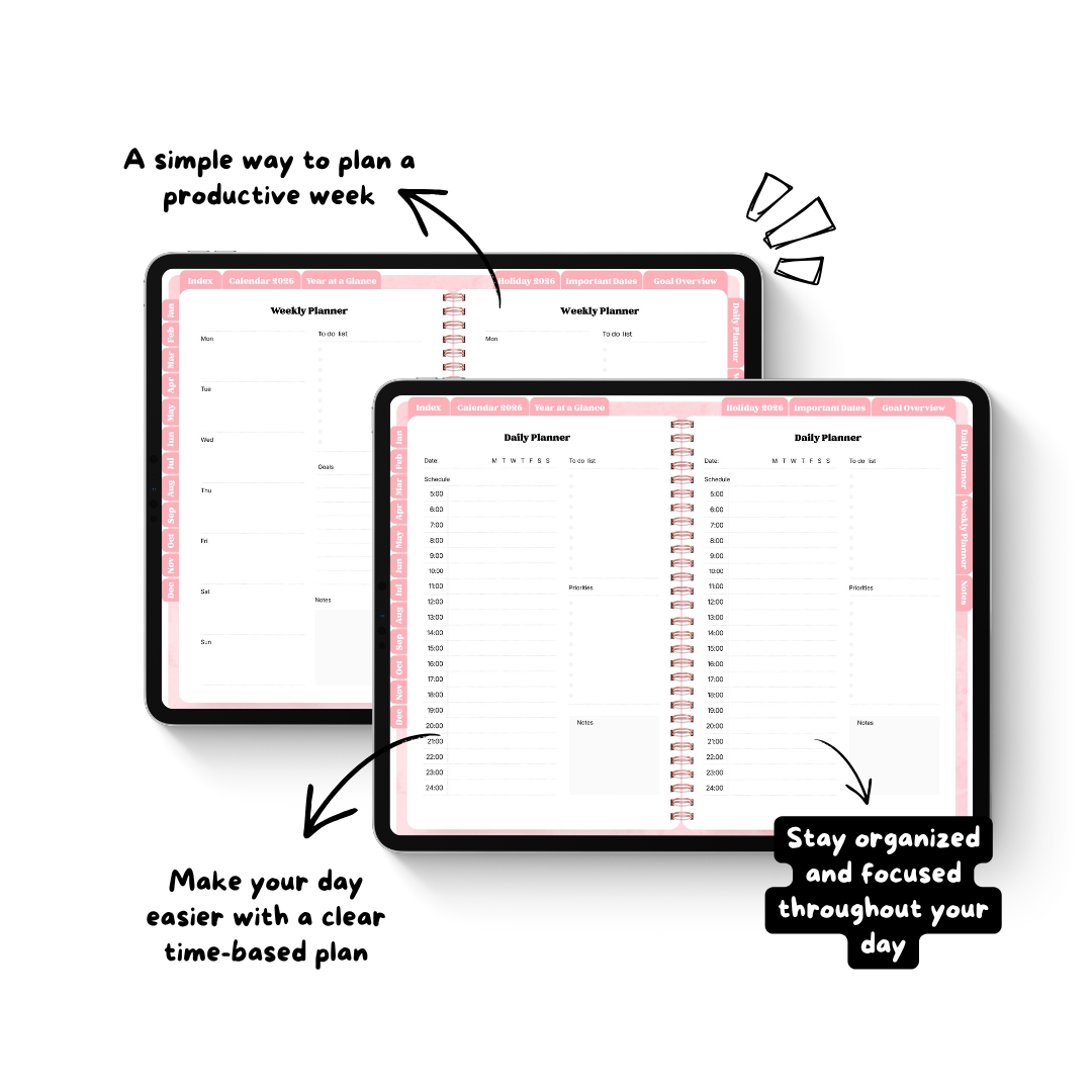 This planner was created for slow, pressure-free planning. With soft pink and clean white tones, it helps you stay organized while keeping things calm, simple, and intentional. This digital planner is designed to work best in landscape orientation.